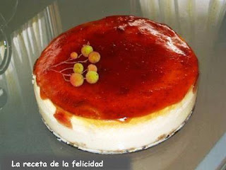 Por último preparamos el sirope. Hidratamos las hojas de gelatina en un vaso de agua. Calentamos la mermelada en el microondas con el zumo de limón (creo que lo puse 45 segundos), y se echa la gelatina a esta mezcla, removiendo hasta que se disuelva totalmente. Cuando la tarta esté totalmente fría, y la gelatina esté templada, se pone sobre la tarta y se mete de nuevo en la nevera. Notas importantes: no batir demasiado la mezcla del relleno, ya que si batimos mucho coge mucho aire y eso hace que la tarta se hinche y se rompa, además de hacerse más quebradiza También es importante dejar enfriar en el horno y no abrir la puerta en ningún momento, porque si no el centro de la tarta se hunde. La cobertura queda más rica si se hace con fresas de verdad en lugar de mermelada, pero en esta ocasión no tenía. Yo lo hago en el microondas un poco a ojo: fresas (en trozos)+zumo de limón+azúcar y luego le añades la gelatina (o incluso sin ella si prefieres que la salsa caiga sobre la tarta como la ponen en el VIP’s)
