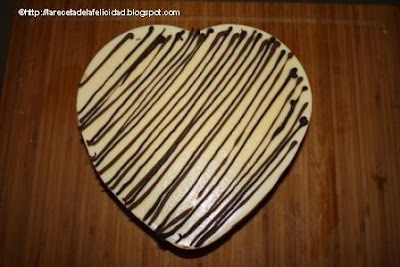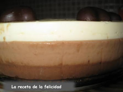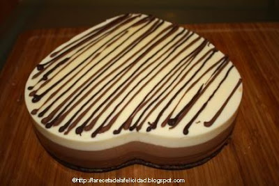 Para el relleno, ponemos el chocolate negro, 200 ml. de leche, 250ml. de nata en un cazo al fuego hasta que se disuelva totalmente y llegue a hervir, mientras en un vaso mezclamos 50 ml de leche con un sobre de cuajada y lo agregamos a la mezcla anterior. Volvemos a poner al fuego hasta que hierva otra vez, y volcamos sobre la base que tenemos preparada. Dejamos sin mover del sitio, y pasamos a preparar la siguiente capa. La siguiente capa se prepara igual que la anterior, pero con chocolate con leche y se vuelca con cuidado sobre la mezcla anterior, usando el dorso de una cuchara para evitar que se mezcle con la capa anterior. Preparamos la capa de chocolate blanco y procedemos igual que anteriormente. Por último, dejamos cuajar, sin moverlo del sitio, y luego introducimos en la nevera. Es mejor hacerla de un día para otro. Desmoldamos con cuidado y… a disfrutar!
