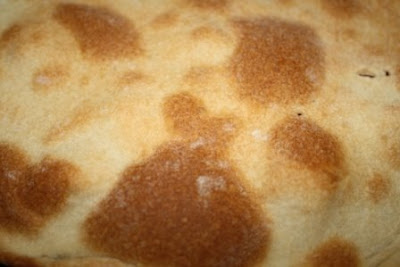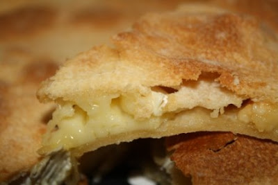 Colocamos la pasta estirada sobre un plato de pizza, y encima colocamos el queso cortado a cuadraditos. Puede parecer una burrada de queso (bueno, es que lo es!), pero la verdad que luego no se hace nada pesado, ni parece demasiado al comer. Tomamos caliente… y a disfrutar!